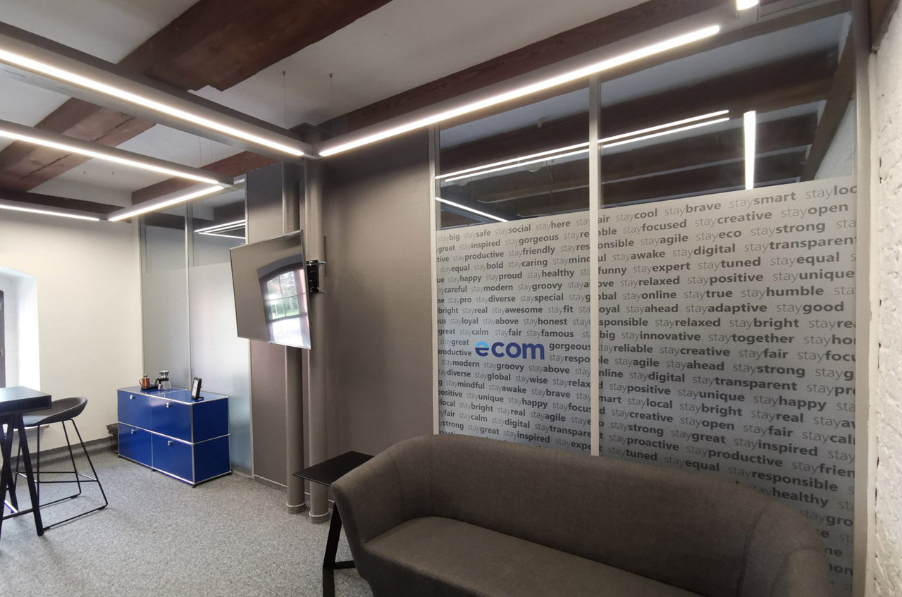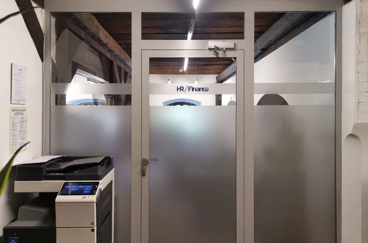 Druk na folii oraz oklejenie szyb w biurze.
