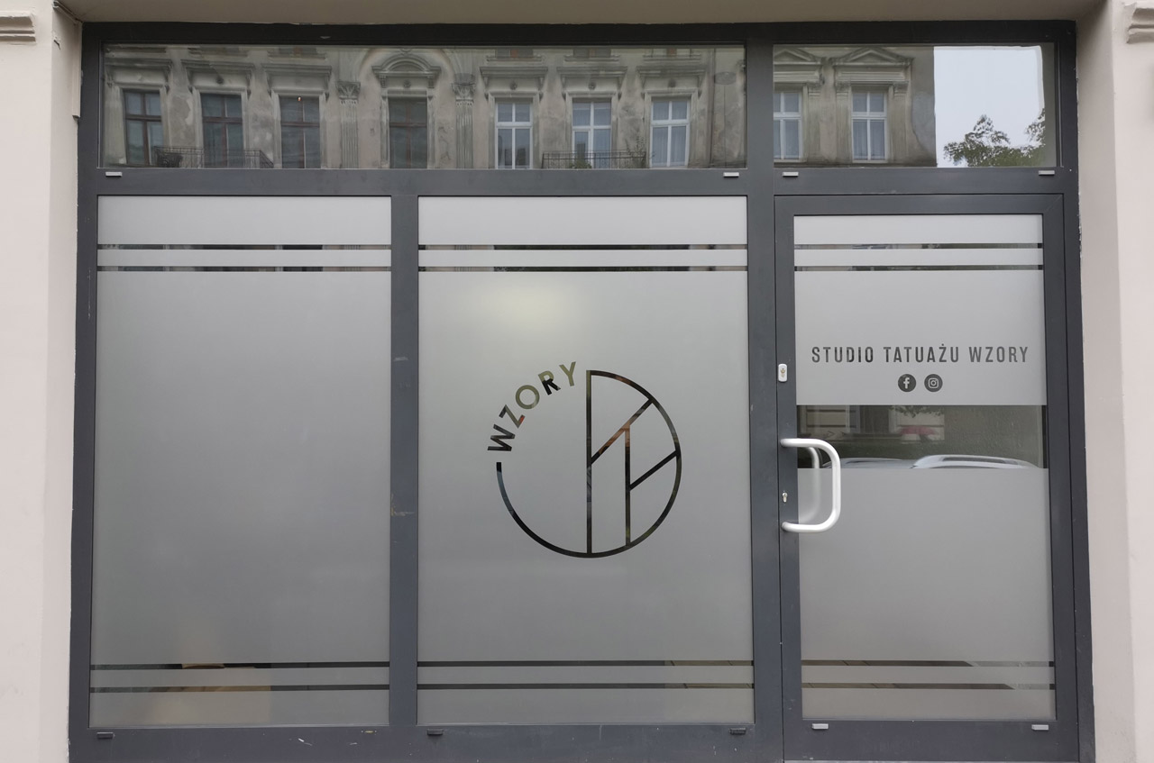 Wycięcie w folii szronionej oraz montaż na witrynie.