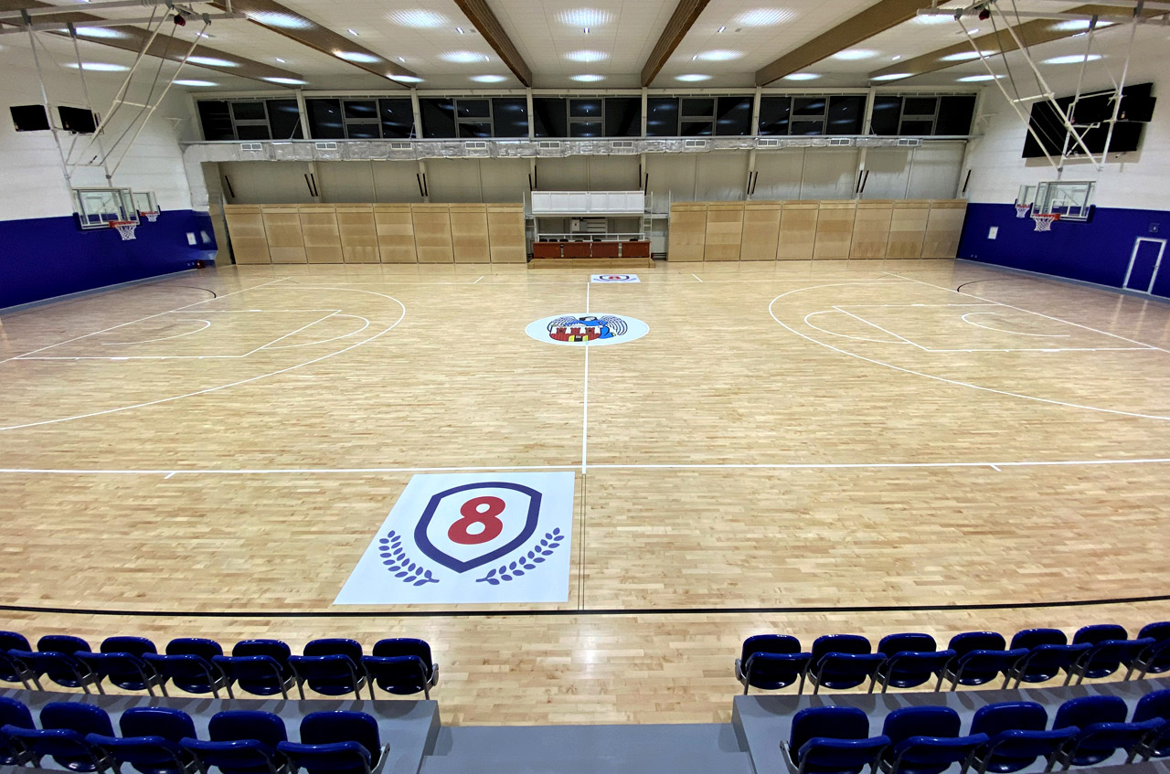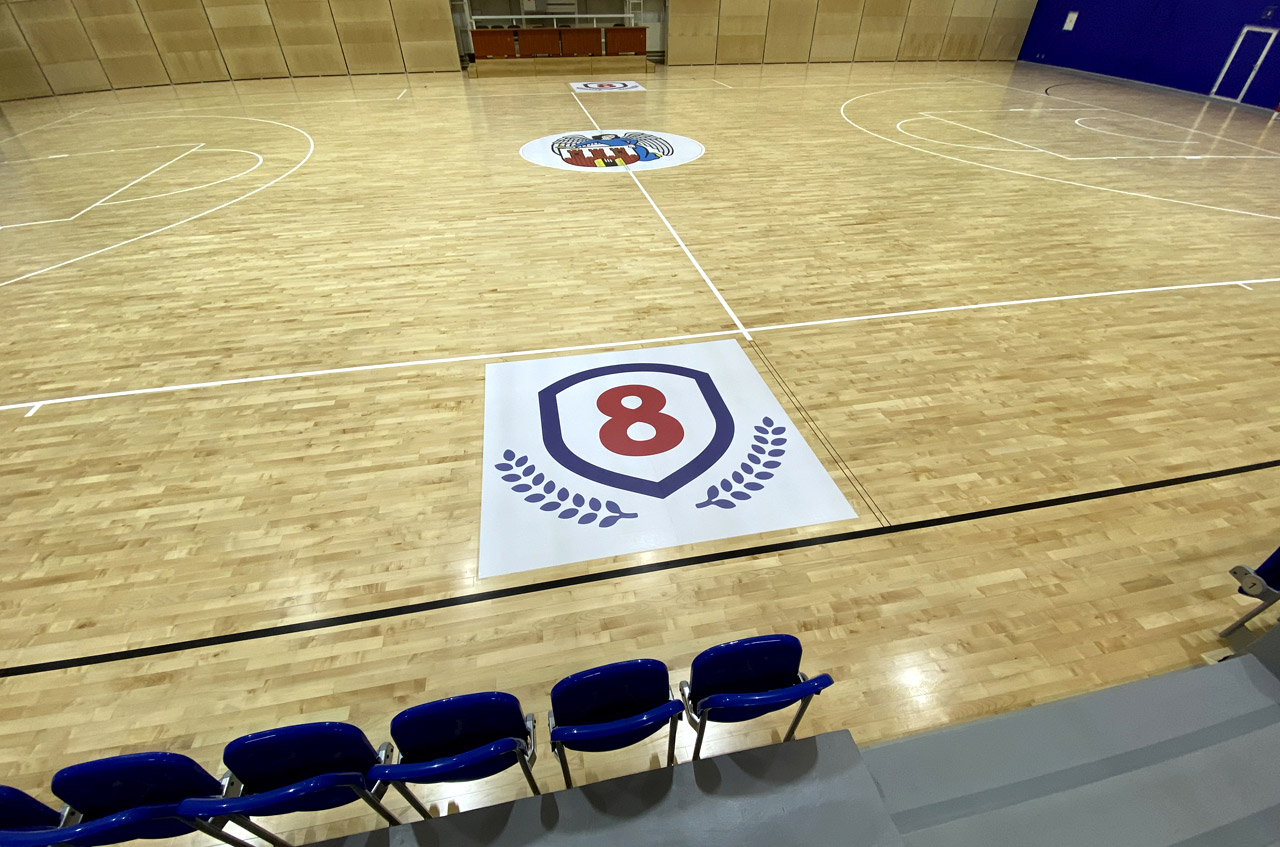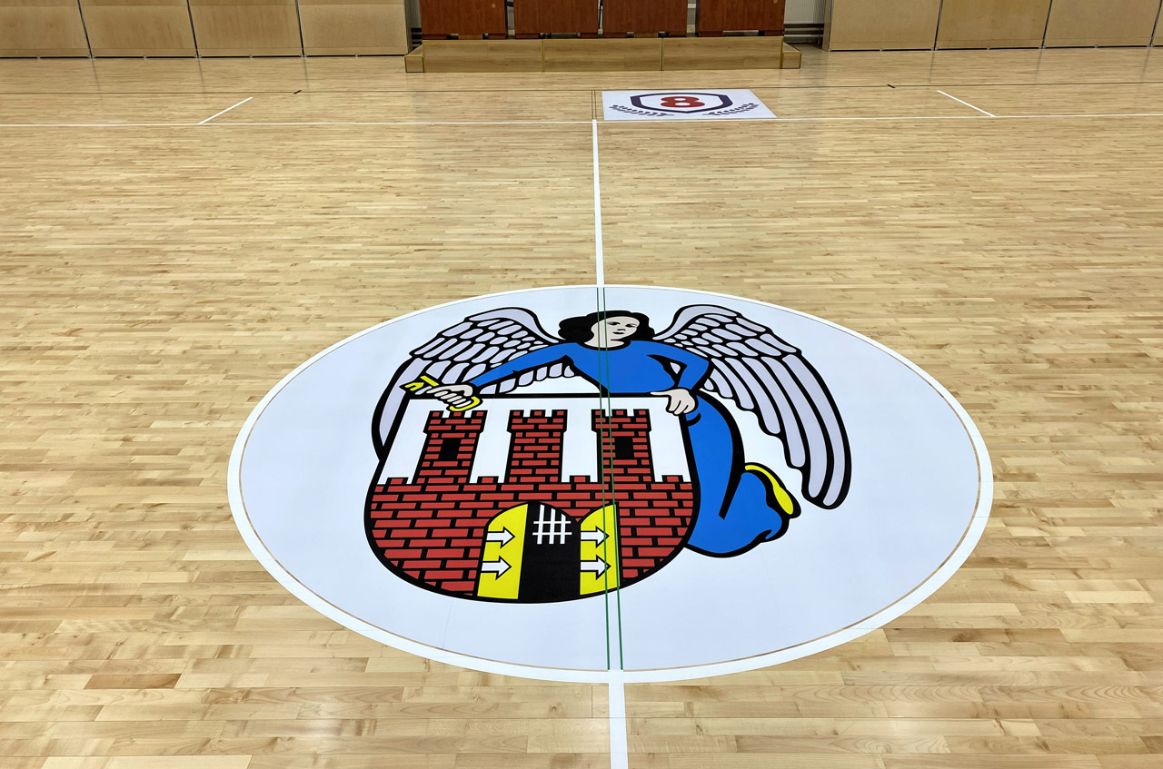 Druk naklejek z laminatem podłogowym oraz montaż ich na płycie boiska.